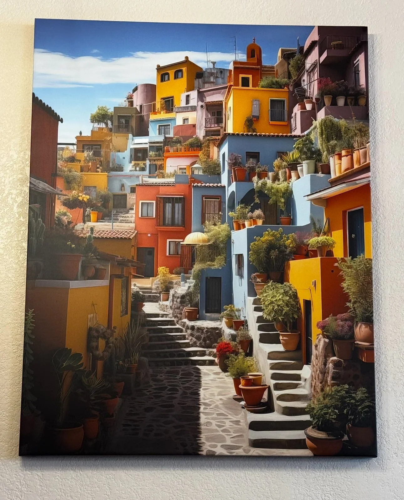 I was having lunch with my mom the other day in a local restaurant and there was a 4’ tall canvas wrap of a beautiful villa alley way, similar to something you’d see in Cinque Terre, Italy. Except it wasn’t real. It was a pretty terrible AI rendering of such a place if you look closely, but it was convincing…enough. Maybe an unedited output from Midjourney circa late 2023 in terms of quality. If you look closely at the plants, or the stones on the street, or the tiles or plant pots or steps, you’ll see what I mean. I would bet the owner bought it online and didn’t even realize this was an output from a system like Midjourney. I only noticed it because we happened to sit directly below it. (See below) This was one of 5 other huge fake canvas prints on the wall. What is even the point of photographers or other visual artists sharing their work or trying to sell it if this is what society chooses over something real.