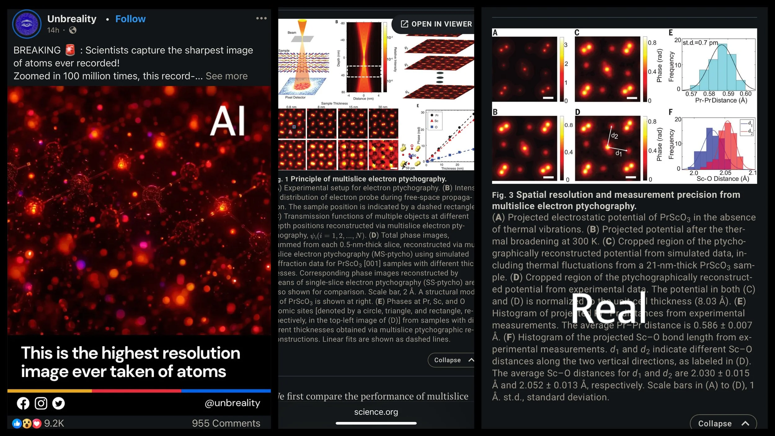 The left is an AI image with an article that seemed to be written by an LLM, while the middle and right screen grabs are from the science.org paper.